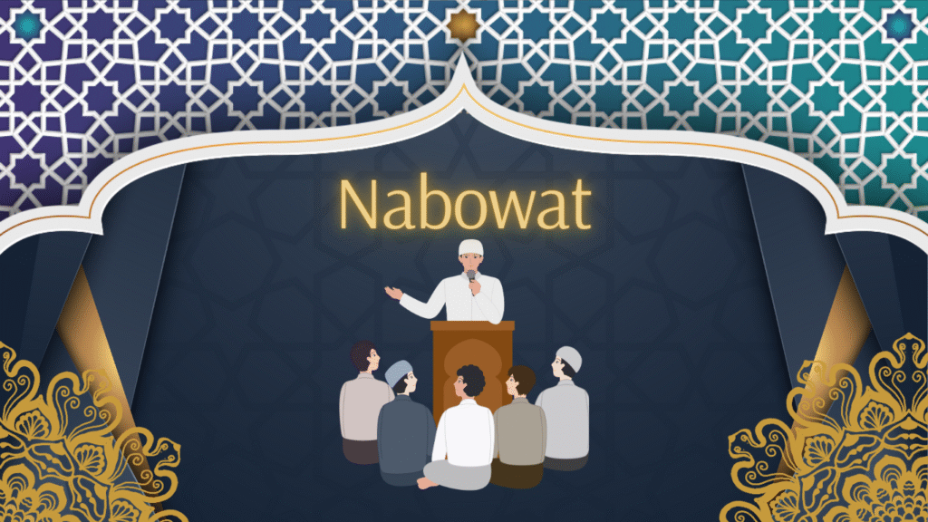 “Nabowat” (نبوت) ka matlab hai Paighambari ya Risalat – yani Allah ki taraf se insaanon ki rehnumai ke liye kisi shakhs ko Nabi banakar bhejna. Ye ek ilahi mansab hai jo sirf Allah ki taraf se ata hota hai.